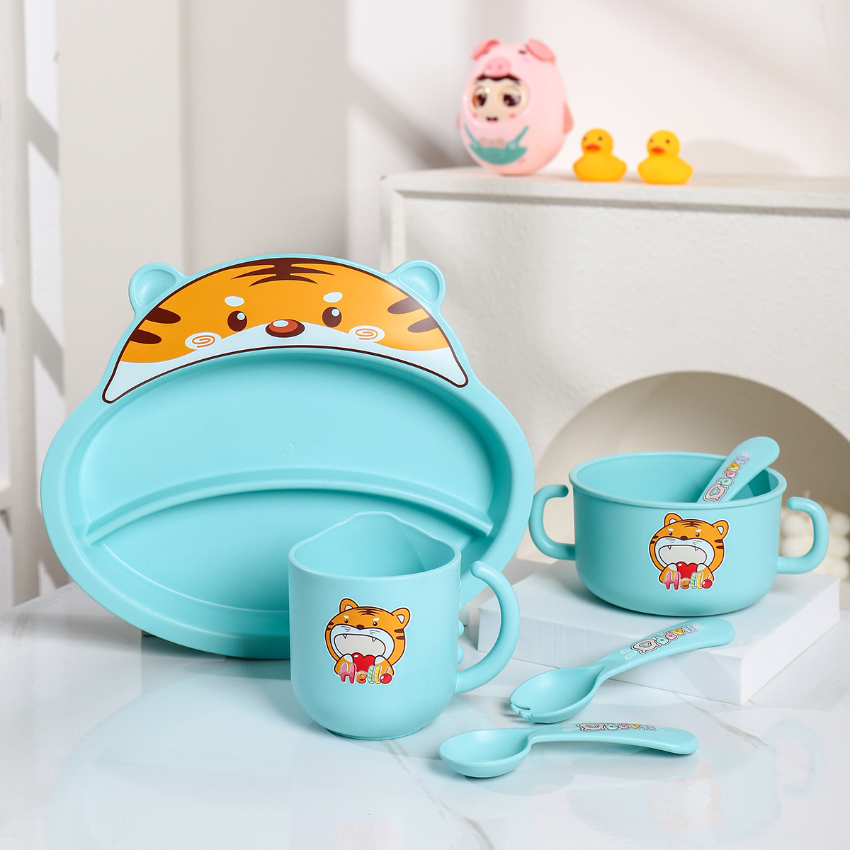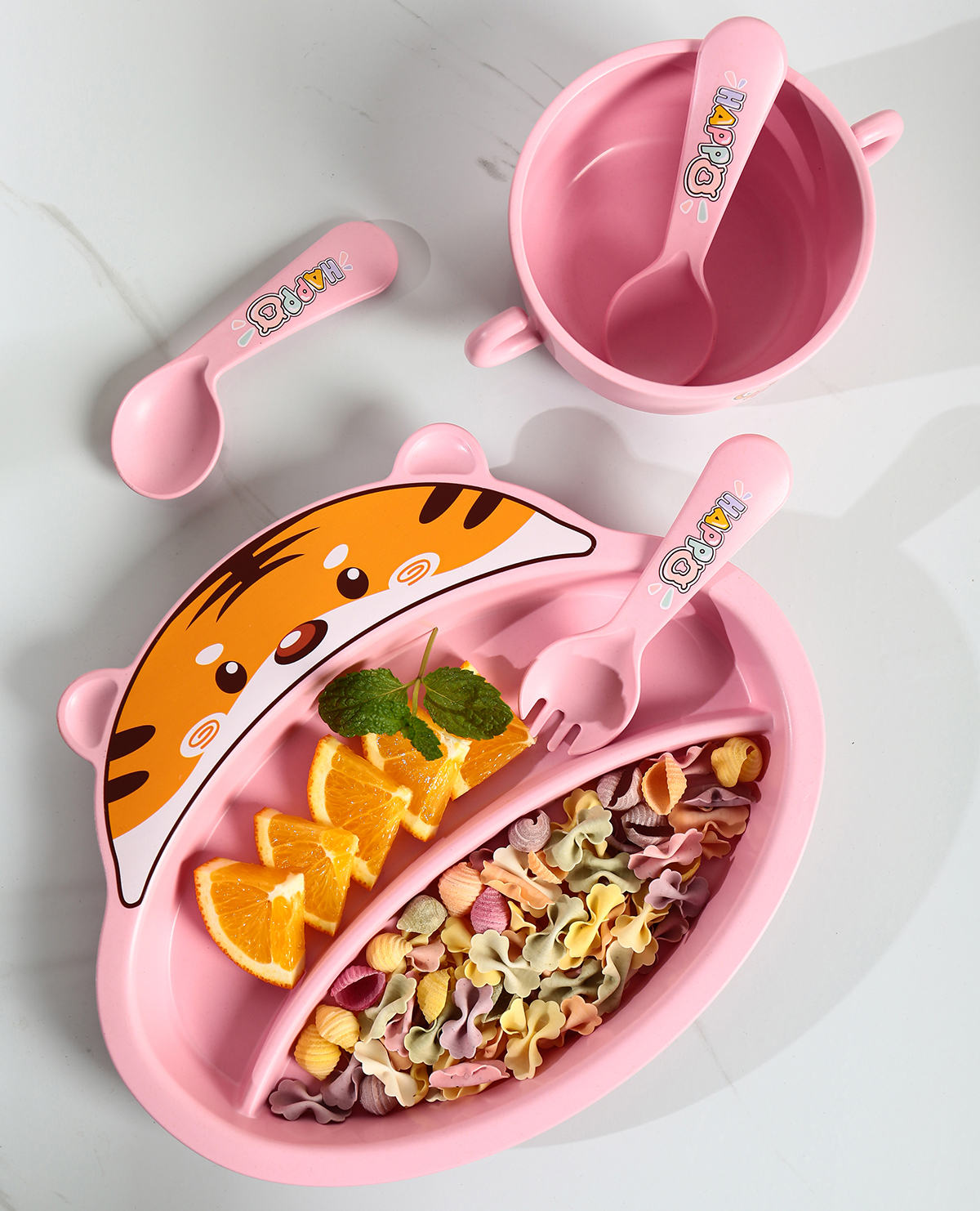 Size: 餐盤(pán):215*253*40mm 碗:160*113*65mm/500ml 杯:110*83*93mm/350ml 勺叉:125mm