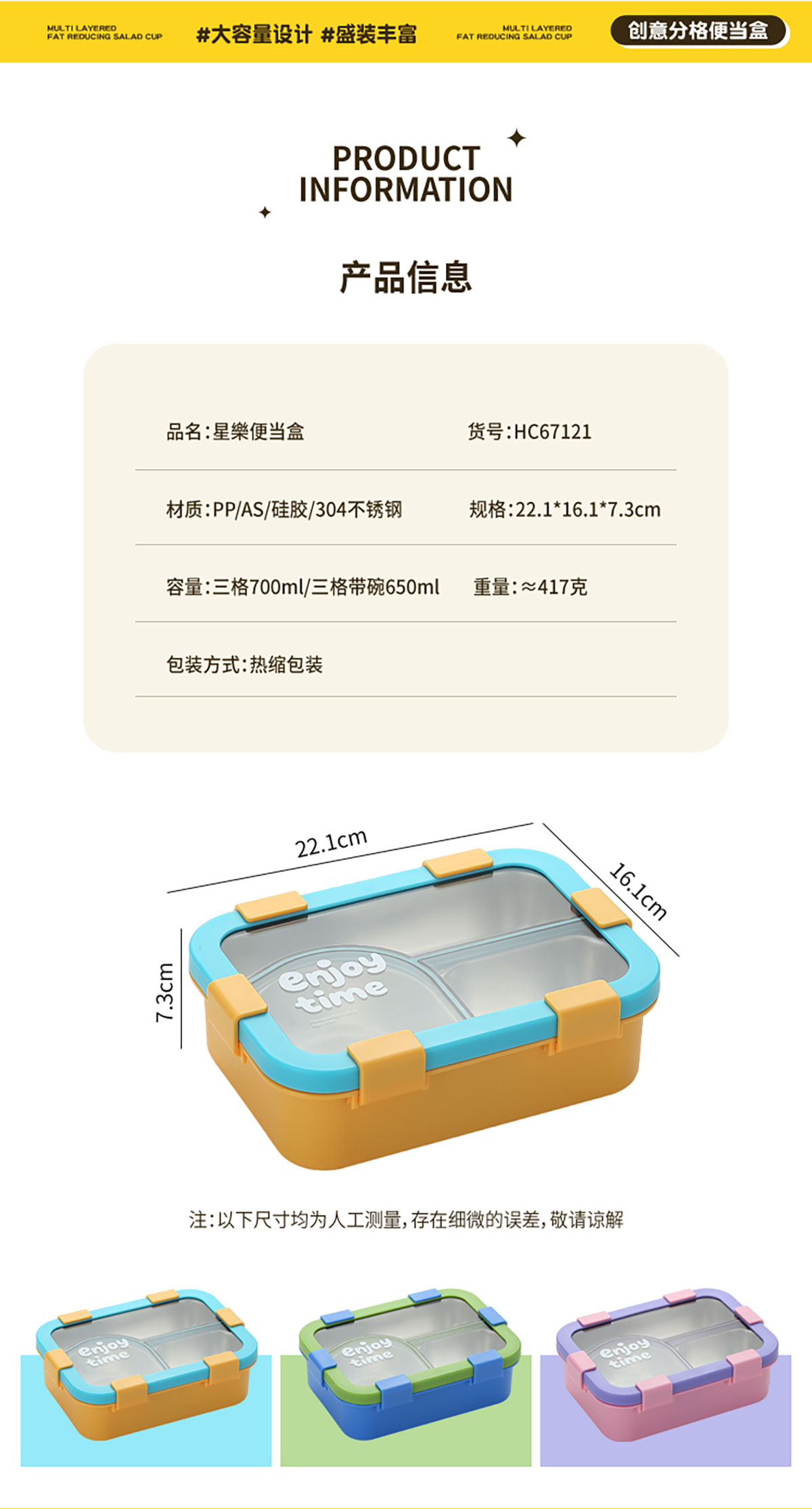 Size: 221*161*73mm/三格700ml/三格碗型650ml