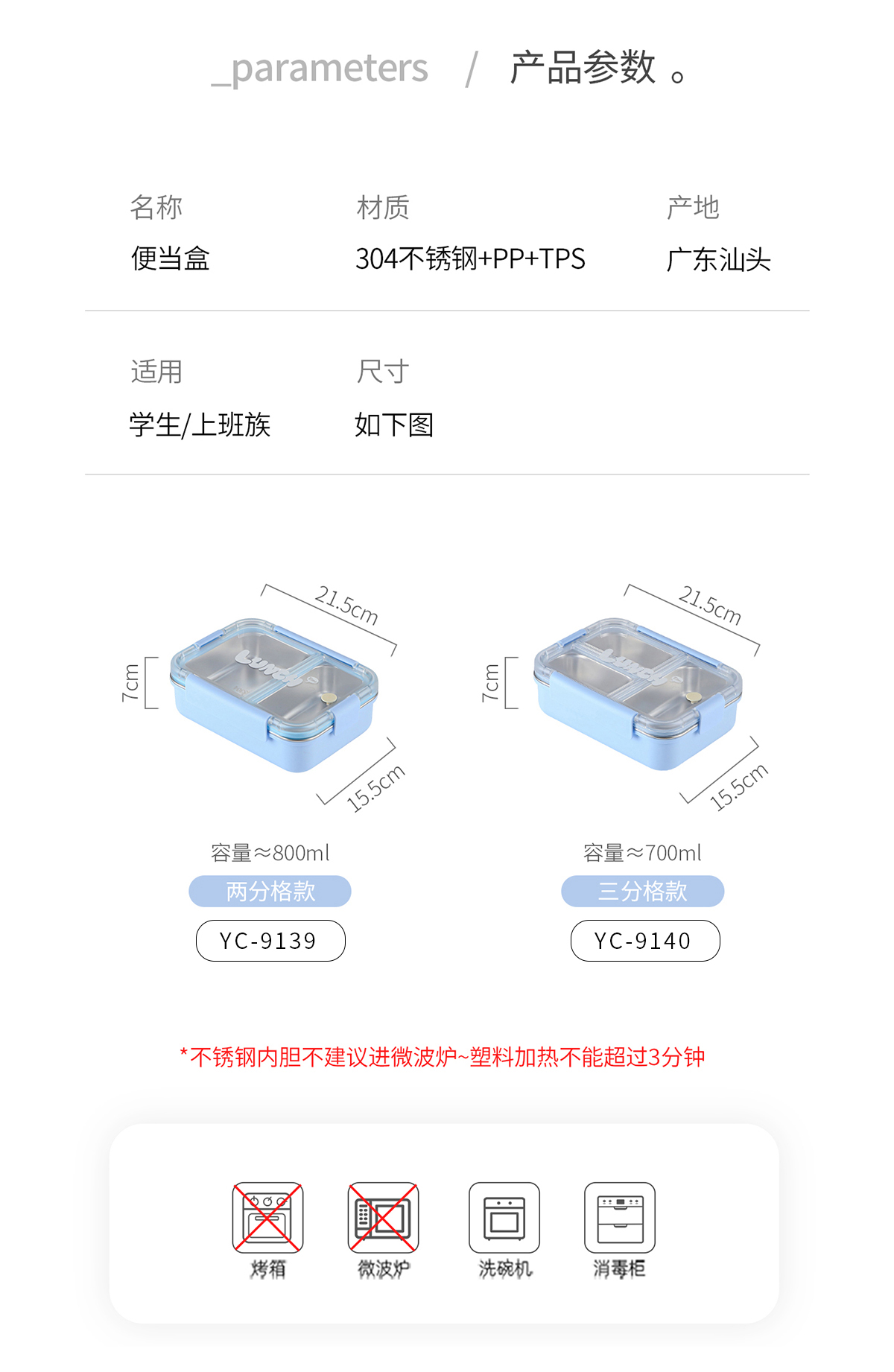 Size: YC-9139(雙格):215*155*70mm/800ml YC-9140(三格):215*155*70mm/700ml